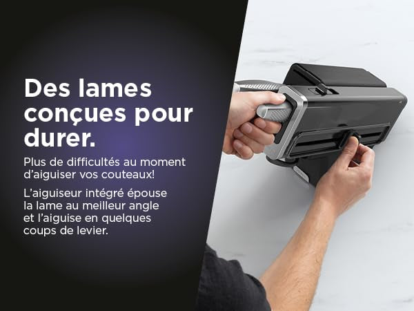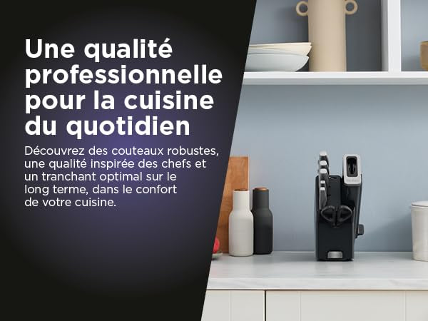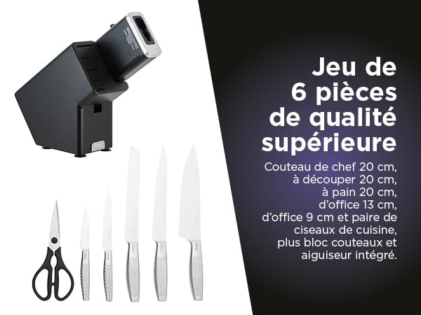 • Inclus : 1 couteau de chef 20 cm, 1 couteau à découper 20 cm, 1 couteau à pain 20 cm, 1 couteau d’office 13 cm, 1 couteau d’office 9 cm, 1 paire de ciseaux de cuisine, 1 bloc couteaux et 1 guide de démarrage rapide
