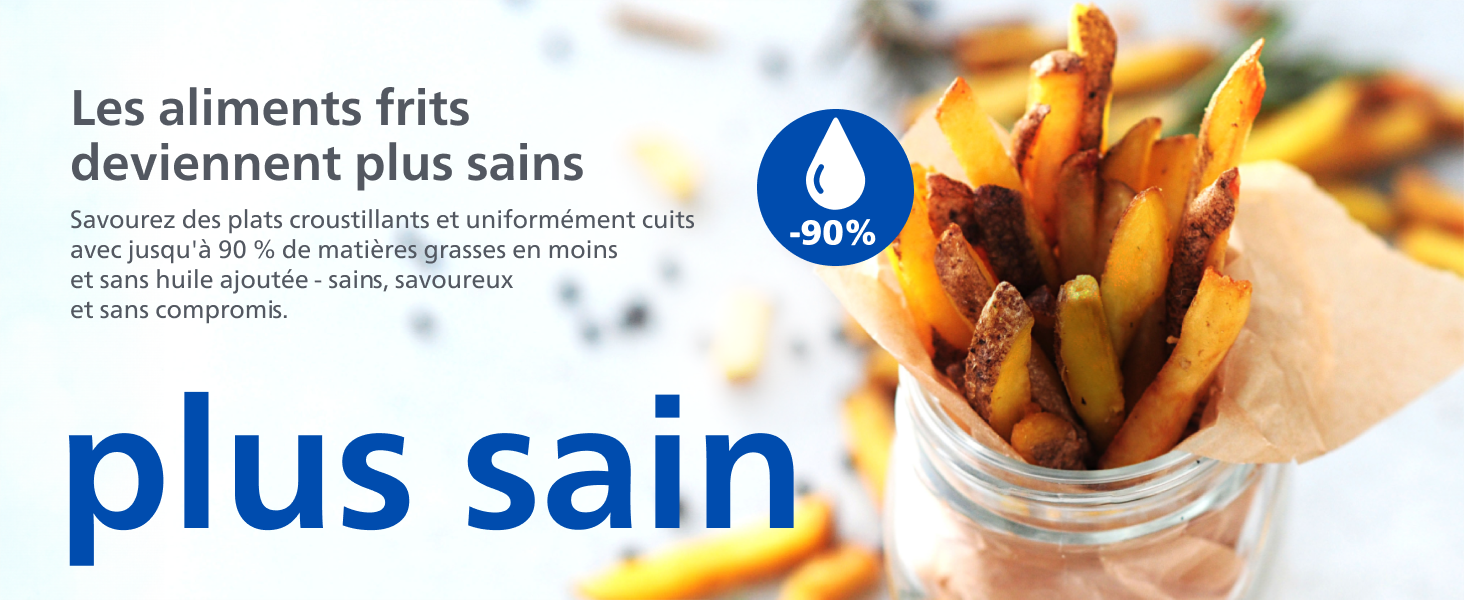 - Réduction de graisse : Jusqu’à 90 % de matières grasses en moins par rapport aux méthodes traditionnelles.