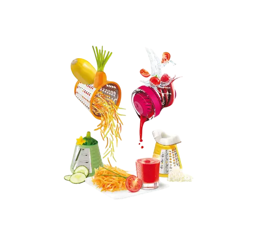 Il sert à râper, trancher, gratter les aliments (fromage, légumes, fruits) et à préparer des nectars grâce à ses cônes interchangeables.