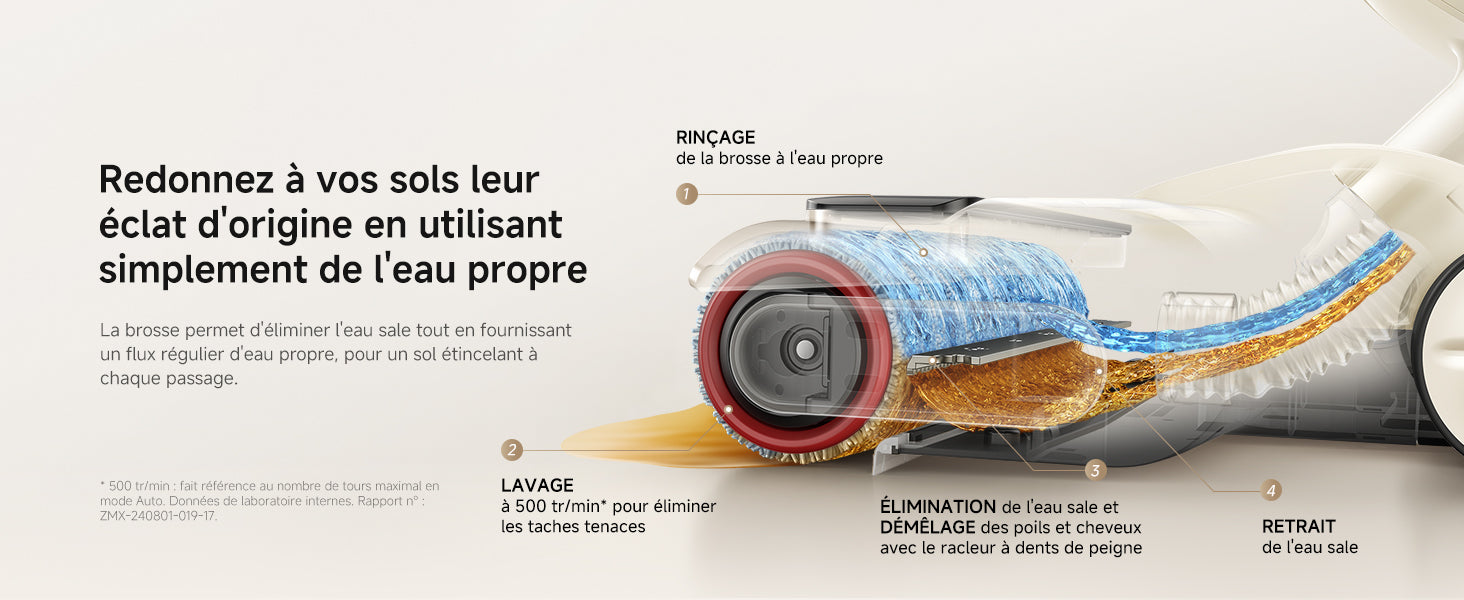 • Lavage rapide à 500 tr/min pour un nettoyage efficace des sols tout en restant silencieux.