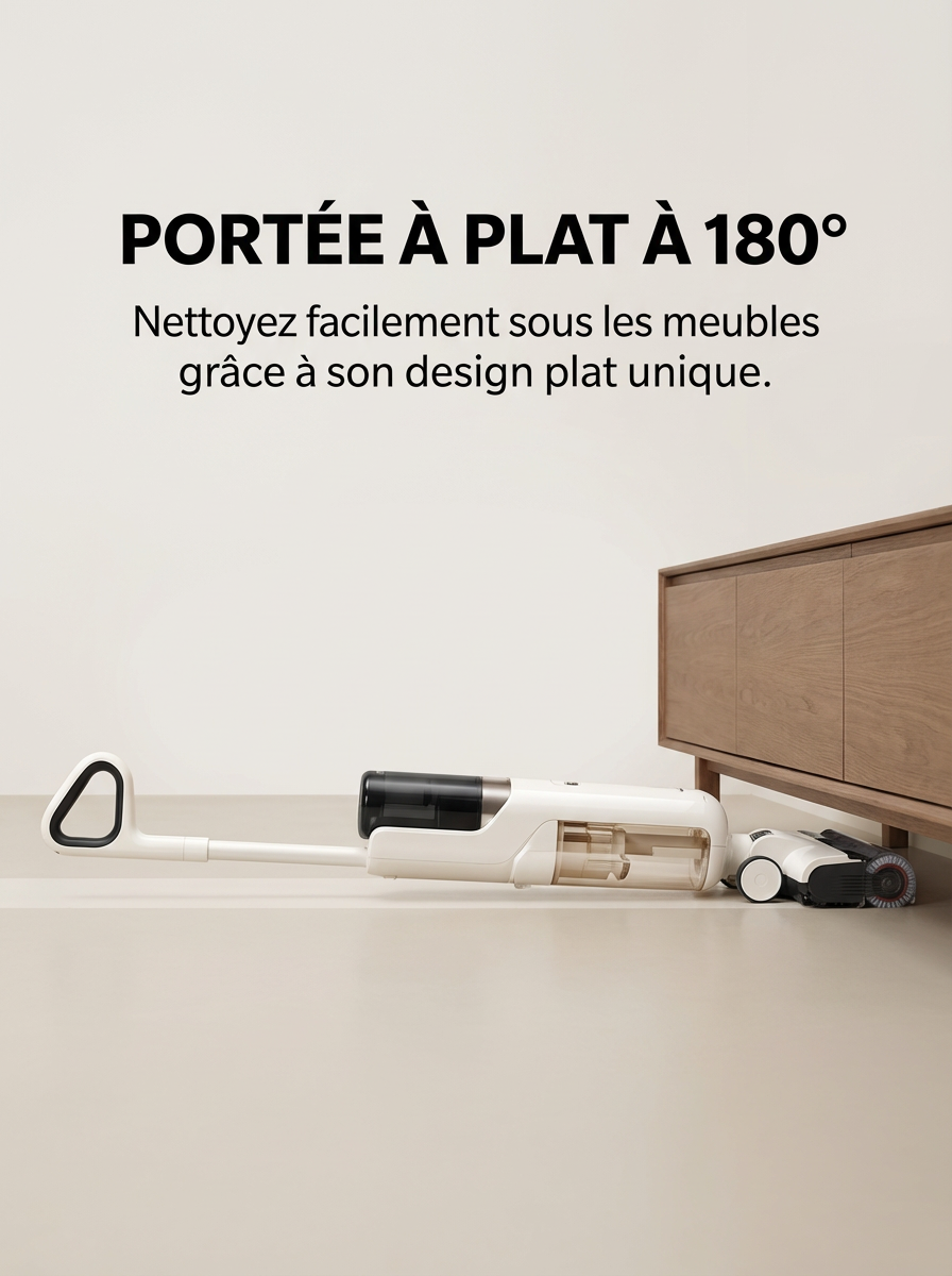 • Portée plate à 180° avec brosse à double bord pour nettoyer facilement sous les meubles et le long des murs.