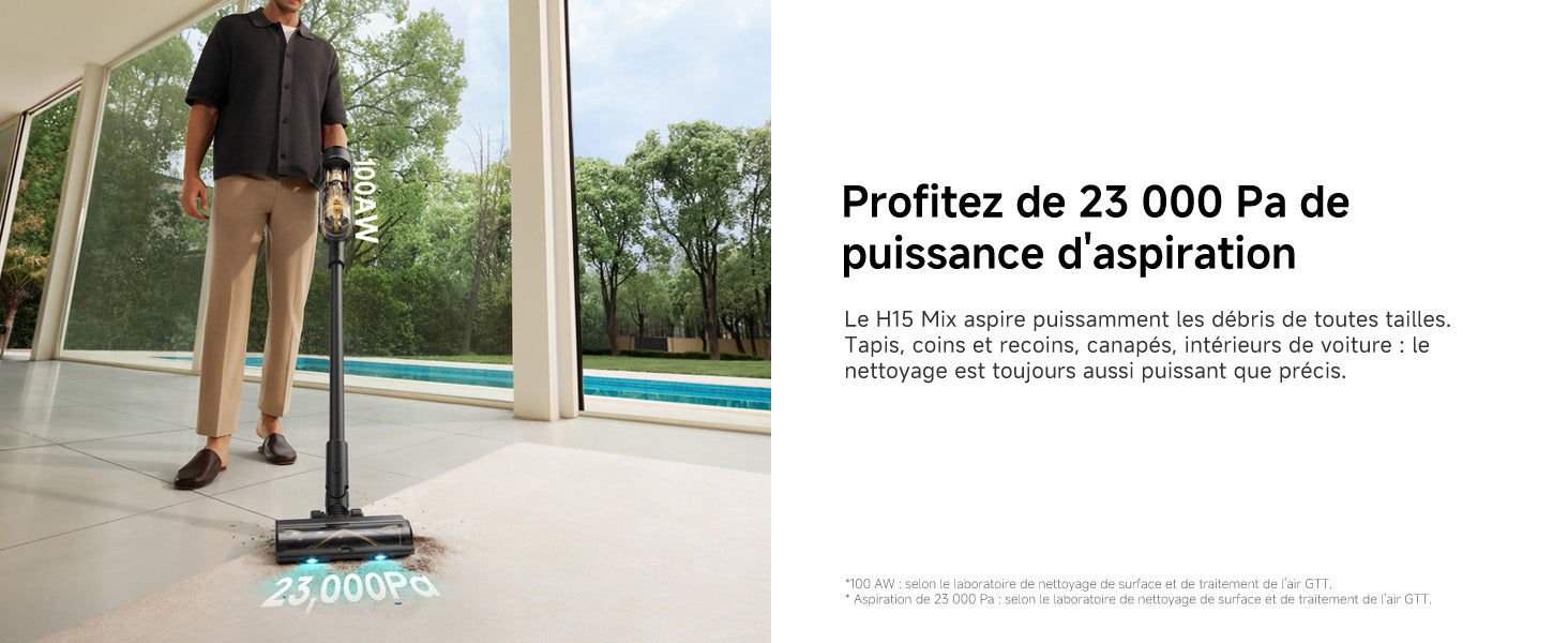 Le H15 Pro offre 60 minutes d'autonomie en mode lavage des sols. Il permet de nettoyer jusqu'à 400 m² sans avoir à le recharger, pour une expérience de nettoyage agréable et efficace du début à la fin*.