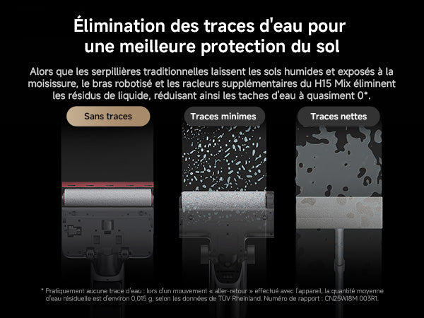 Le bras robotisé, qui combine deux racleurs supplémentaires, fonctionne en parfaite harmonie pour recueillir les liquides restants*. En effet, le nettoyage traditionnel à la serpillière peut entraîner un risque de moisissure, d'accumulation d'odeurs, de gonflement et de déformation des planchers en bois.