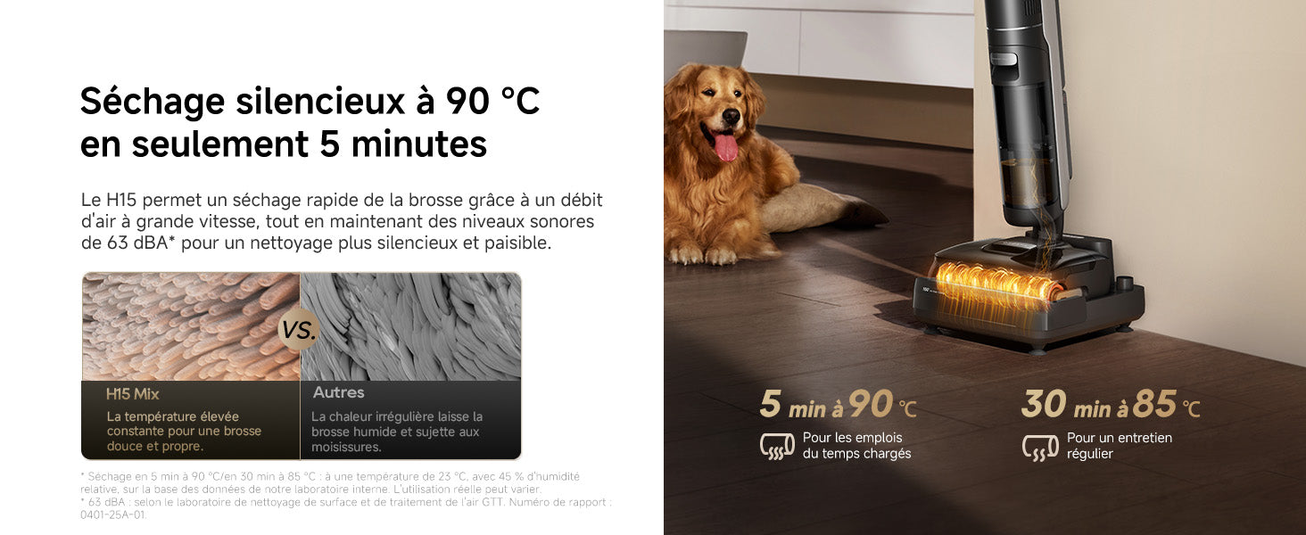 La brosse à double rotation du H15 Pro imite le lavage manuel, en s'appuyant sur le racleur spécial pour éviter les nœuds et garder le couvercle de la brosse propre, ce qui vous permet de gagner du temps et de réduire vos efforts.