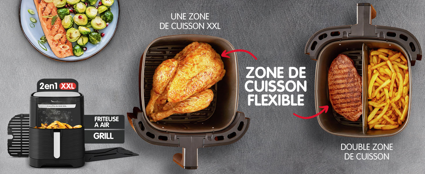 une friteuse à air chaud 2-en-1 d'une capacité XXL (1,5 Kg) pour des résultats rapides. Préparez deux recettes différentes en même temps grâce au séparateur Flexcook