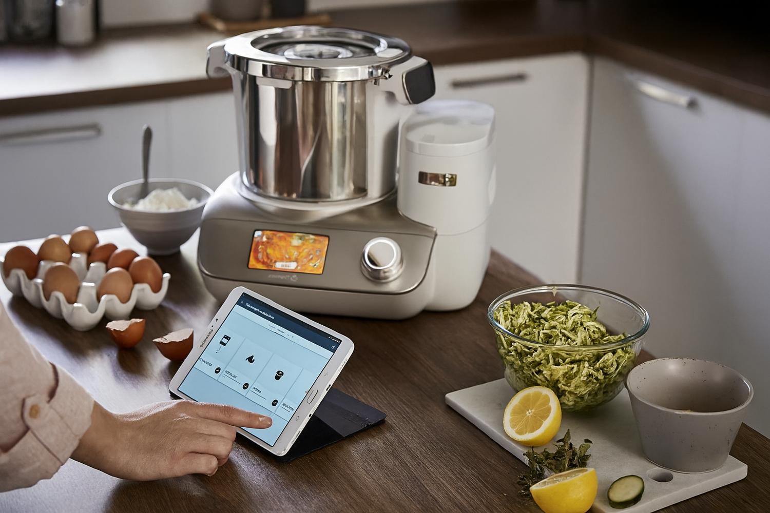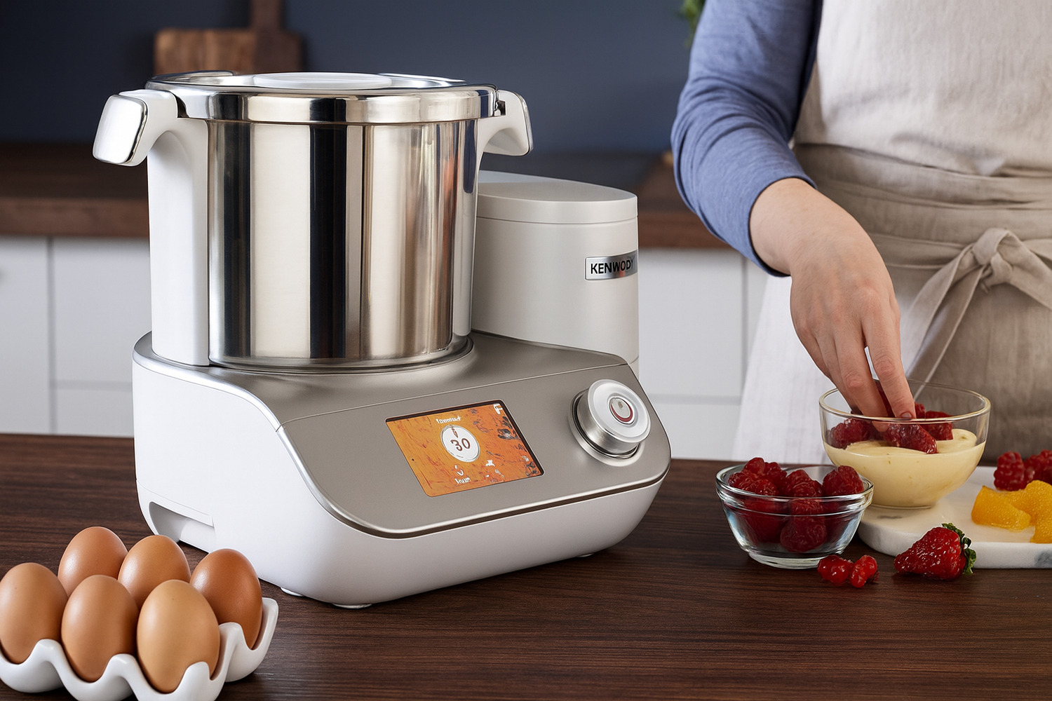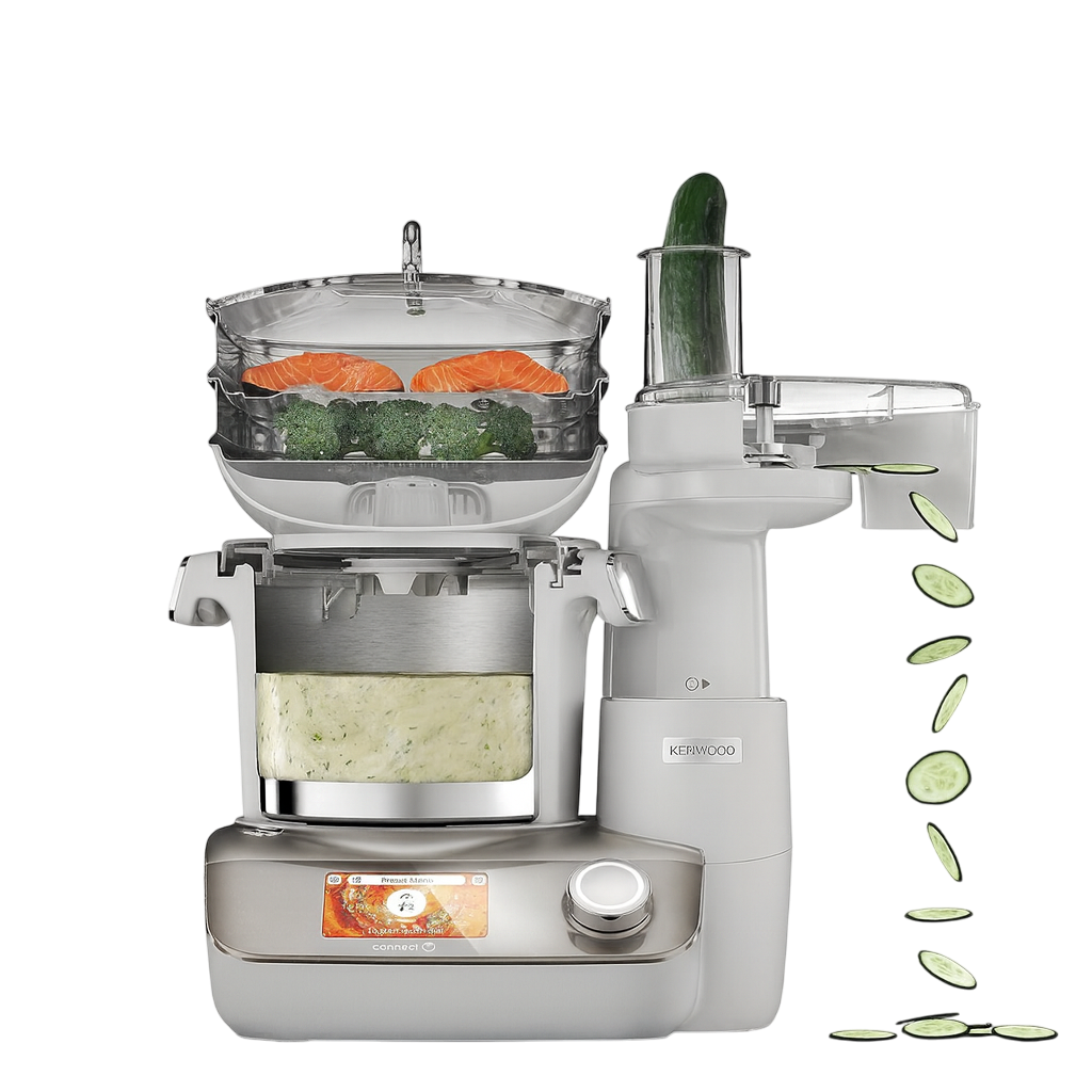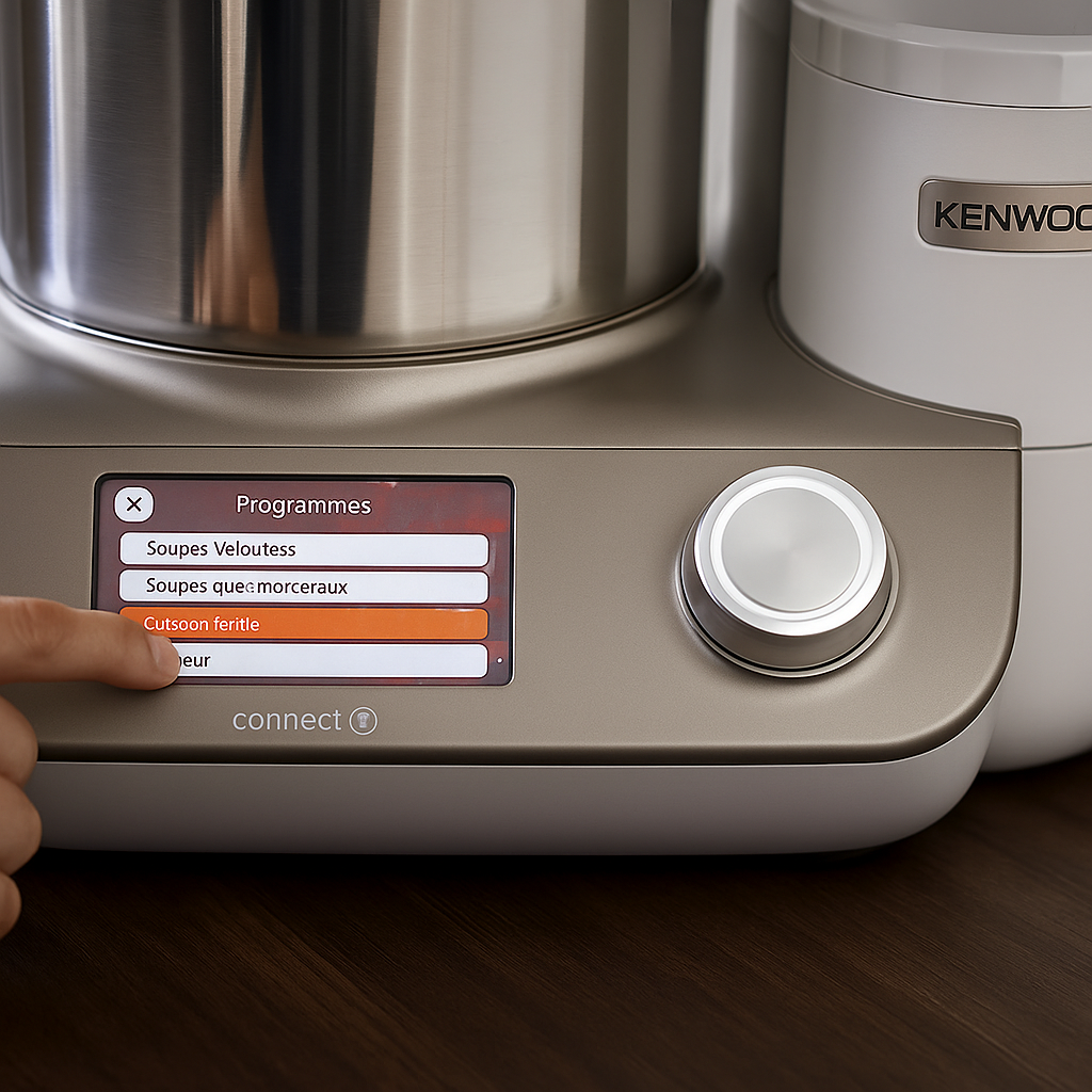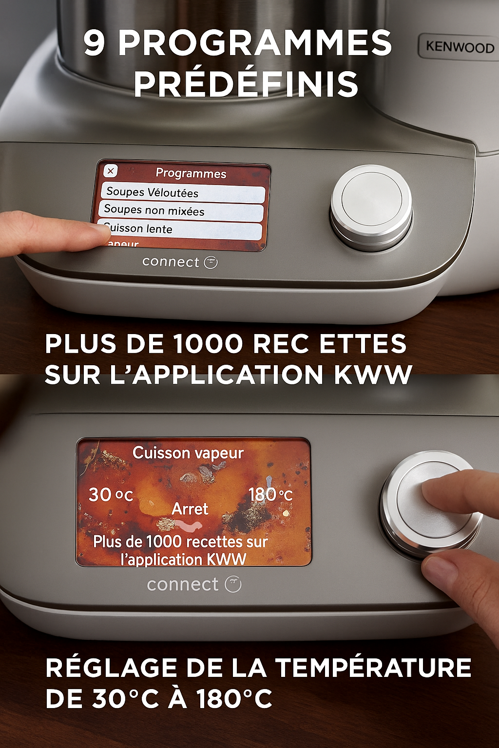 Connecté à l’application Kenwood World, il s’enrichit de nombreuses recettes qui guident pas à pas tous ceux qui souhaitent se lancer dans des préparations culinaires complexes.