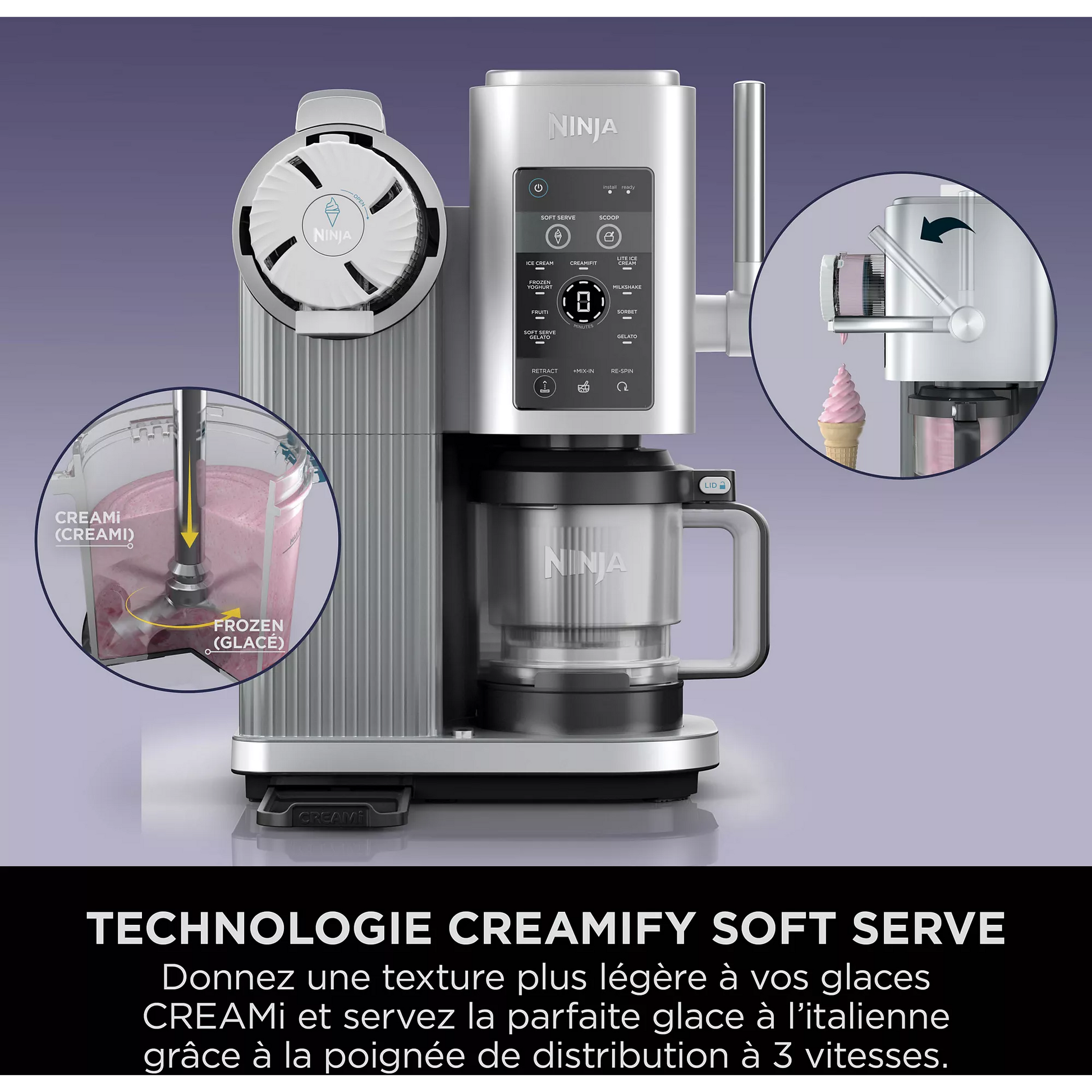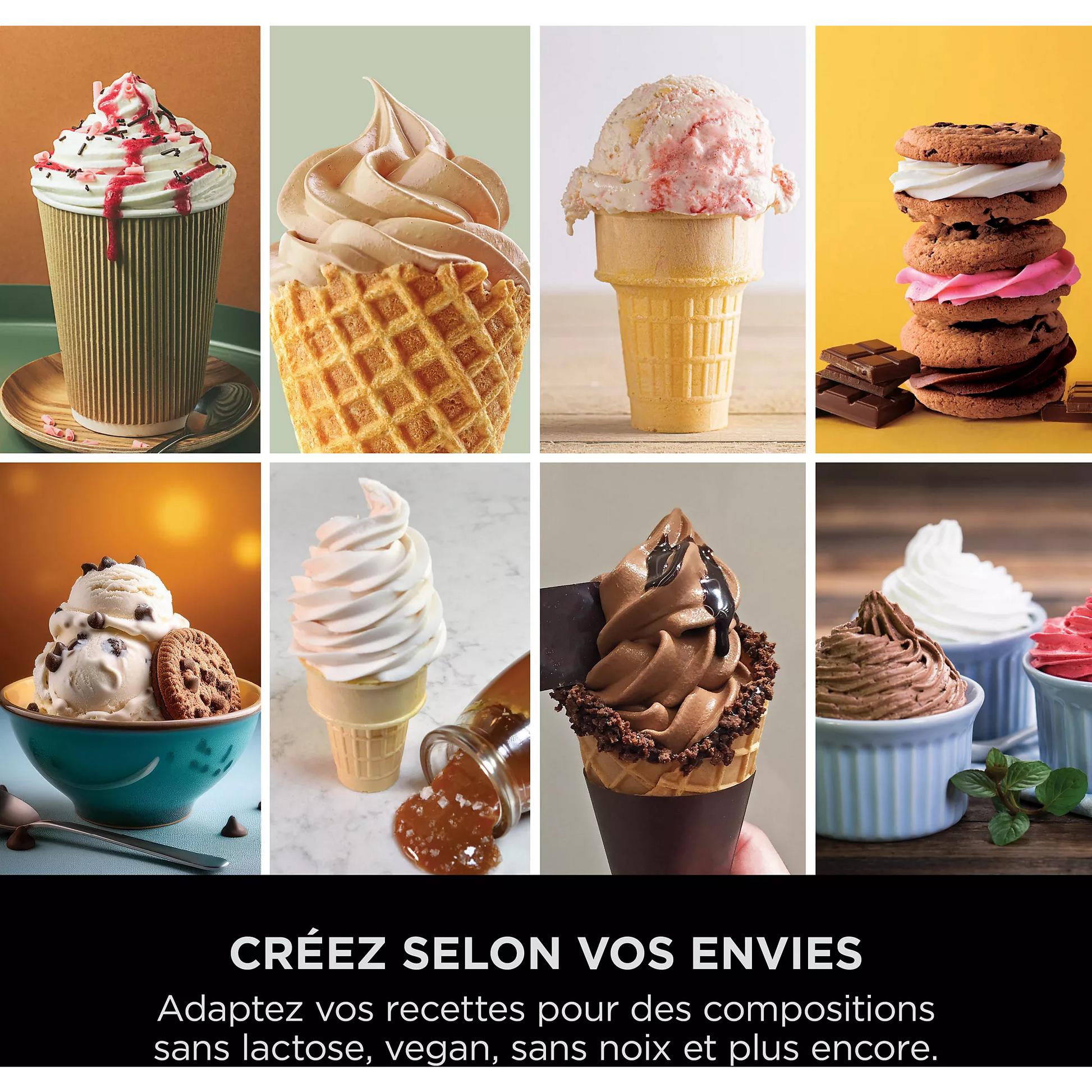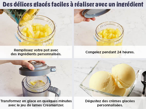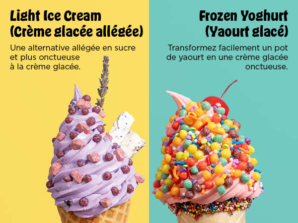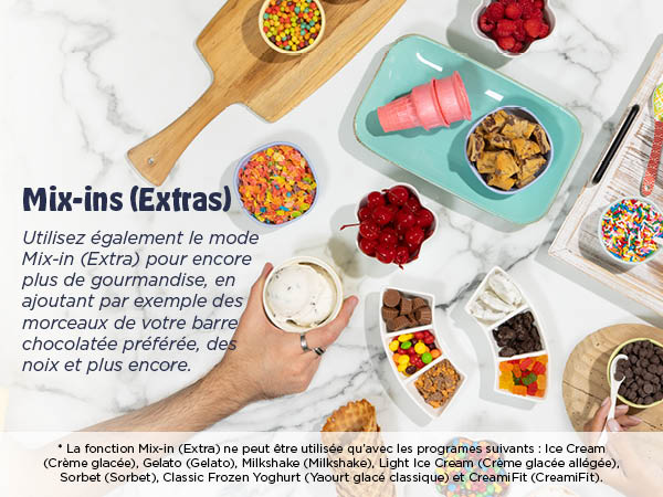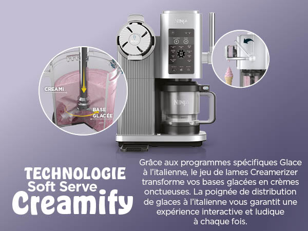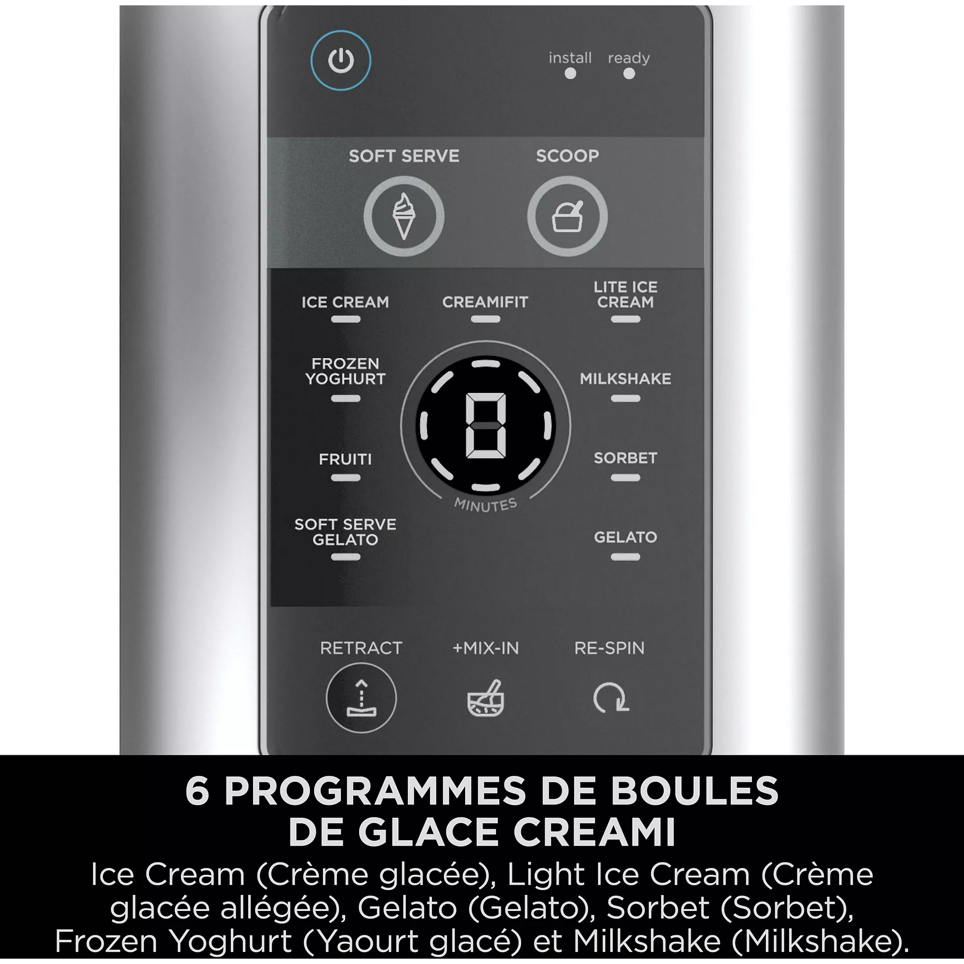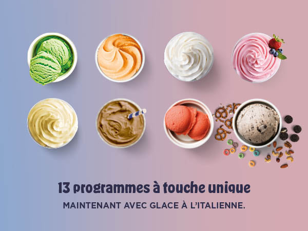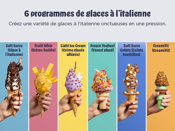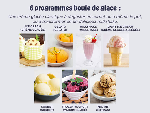 Avec 6 progammes classiques CREAMI: Ice Cream (Crème glacée), Light Ice Cream (Crème glacée allégée), Gelato (Gelato), Sorbet (Sorbet), Frozen Yoghurt (Yaourt glacé) et Milkshake (Milkshake).