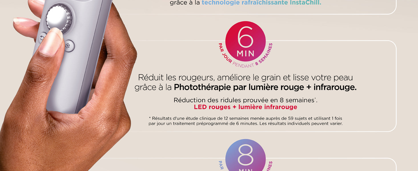 • Technologie iQLED utilisant lumière rouge, bleue et infrarouge profonde, développée avec des dermatologues pour un soin avancé de la peau.