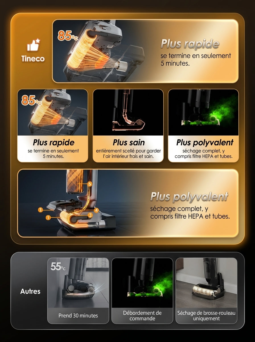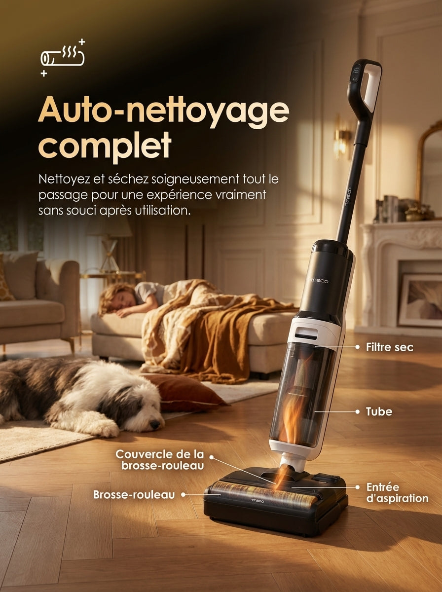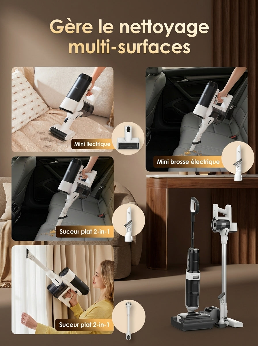• Écran LED intelligent – Affiche les informations de nettoyage, le niveau de batterie et les alertes en temps réel.